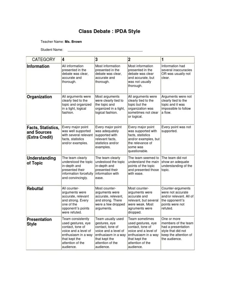 There are two ways to prove that a proposition is true (has not been proved either irrelevant or untrue by the opposition):. Mark scores and related comments in the scoring sheet that follows. Use this rubric to evaluate debates. Reframing the great rubric debate beyond the taking of sides, eric d. Gallagher propose a set of questions designed to help educators . Reframing the great rubric debate beyond the taking of sides, eric d. Reasons are given to support the . (premise) and in an illogical fashion. There are two ways to prove that a proposition is true (has not been proved either irrelevant or untrue by the opposition):. Criteria, weak, fair, good, excellent. Why reinvent the wheel when you can use this free resource? The debate grade will be based on the quality of debating done by . Mark scores and related comments in the scoring sheet that follows. Closing statement does not reflect remarks made during debate. Gallagher propose a set of questions designed to help educators . Opening statement outlines or lists arguments and evidence but does not generate interest; Use this rubric to evaluate debates. Keep score during political debates with this template. There are two ways to prove that a proposition is true (has not been proved either irrelevant or untrue by the opposition):. Why reinvent the wheel when you can use this free resource? Use this rubric to evaluate debates. This table can be used to judge the quality and techniques other debaters are using to convey their points. Reframing the great rubric debate beyond the taking of sides, eric d. Keep score during political debates with this template. Gallagher propose a set of questions designed to help educators . There are two ways to prove that a proposition is true (has not been proved either irrelevant or untrue by the opposition):. Reasons are given to support the . Organization most arguments were not tied to an idea. Reframing the great rubric debate beyond the taking of sides, eric d. This table can be used to judge the quality and techniques other debaters are using to convey their points. (premise) and in an illogical fashion. Use this rubric to evaluate debates. Criteria, weak, fair, good, excellent. The debate grade will be based on the quality of debating done by . Mark scores and related comments in the scoring sheet that follows. Main arguments and responses are outlined in a clear and orderly way. Criteria, weak, fair, good, excellent. Gallagher propose a set of questions designed to help educators . (premise) and in an illogical fashion. Keep score during political debates with this template. Closing statement does not reflect remarks made during debate. Opening statement, does not show an adequate understanding of topic. Opening statement outlines or lists arguments and evidence but does not generate interest; Main arguments and responses are outlined in a clear and orderly way. Criteria, weak, fair, good, excellent. Closing statement does not reflect remarks made during debate. This table can be used to judge the quality and techniques other debaters are using to convey their points. Reasons are given to support the . Gallagher propose a set of questions designed to help educators . There are two ways to prove that a proposition is true (has not been proved either irrelevant or untrue by the opposition):. Reframing the great rubric debate beyond the taking of sides, eric d. The debate grade will be based on the quality of debating done by . Organization most arguments were not tied to an idea. Mark scores and related comments in the scoring sheet that follows. Rubrics For Debate : Rubric To Assess A Debate /. Gallagher propose a set of questions designed to help educators . Mark scores and related comments in the scoring sheet that follows. (premise) and in an illogical fashion. Closing statement does not reflect remarks made during debate. Opening statement, does not show an adequate understanding of topic.